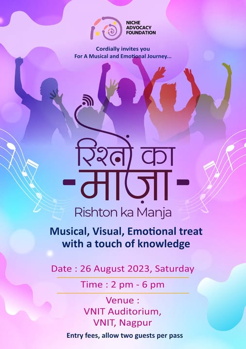 NICHE Advocacy Foundation, together with VNIT Nagpur, organized Rishton Ka Manja 7.0 on 26th August 2023 at the VNIT Auditorium, Nagpur, from 2.00pm to 6.00pm. The event offered a lively musical infotainment program, bringing together attendees for an engaging and entertaining experience celebrating music and community.