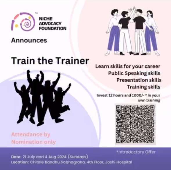 NICHE Advocacy Foundation announced the Train the Trainer program, a 12-hour skill-building workshop designed to enhance public speaking, presentation, and training skills. Conducted on 21st July and 4th August 2024 at Chitale Bandhu Sabhagraha, Joshi Hospital, the program aimed to equip participants with practical tools for career growth.